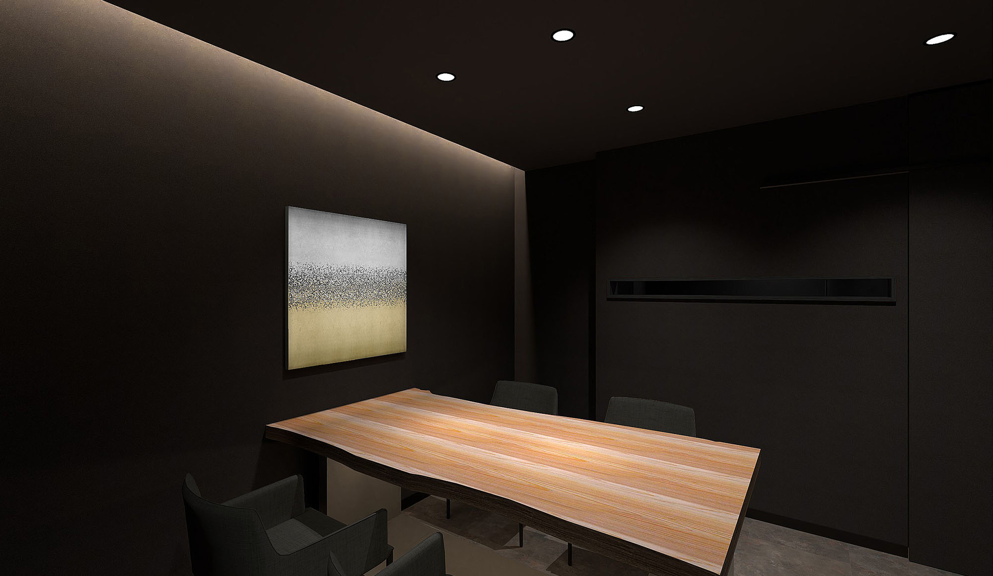 The interior features a chic black-based design, highlighted by a rare and beautifully grained zelkova wood table, along with custom-made panels adorned with Kanazawa’s traditional gold leaf and platinum craftsmanship.